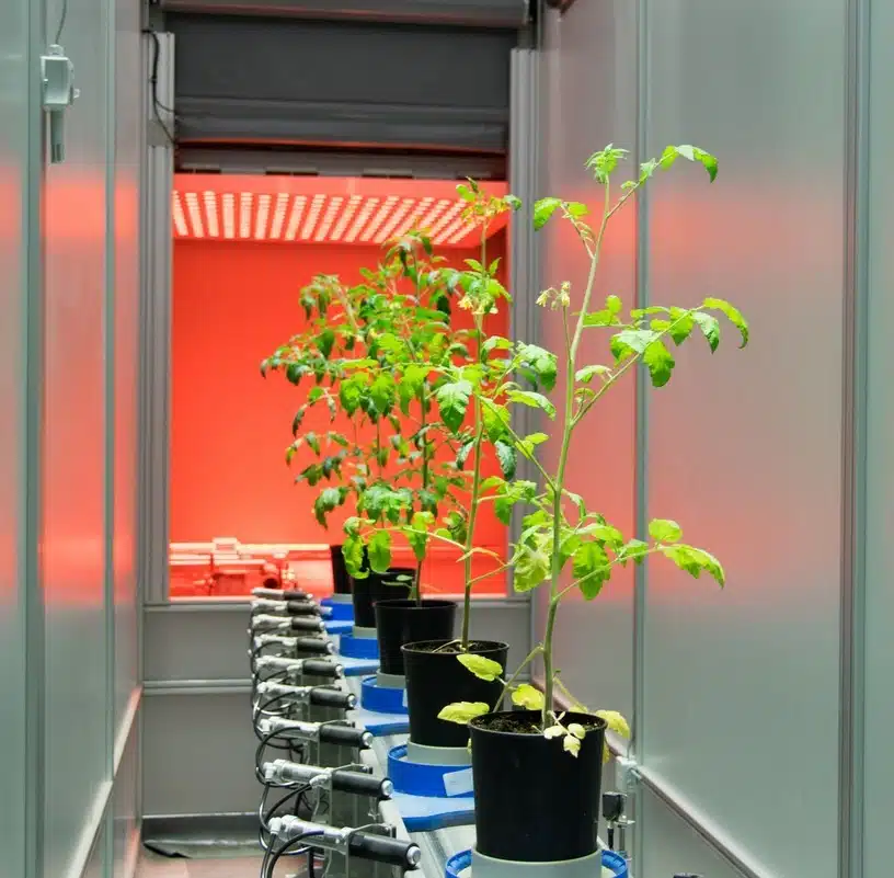 If required, Qubit Phenomics can design growth facilities optimised for plant phenotyping. We will also consult with clients on how best to incorporate phenotyping equipment into existing growth facilities. The adaptation tunnel for plant equilibration is a key feature of our phenotyping platforms, consisting of multichannel LEDs and a programmable interface for defining desired light regimes and spectral quality. Irradiance is programmable in smooth steps from zero to maximum (typically 2000 µmol/m2/s) in 1% steps. The tunnel is constructed as a light isolated box with double automatic light-tight entrance and exit doors, and is designed for both light and dark adaptation of the plants. The adaptation tunnel may be designed to accommodate one, or several lines of plants, with adaptation periods ranging from a few minutes to tens of minutes.